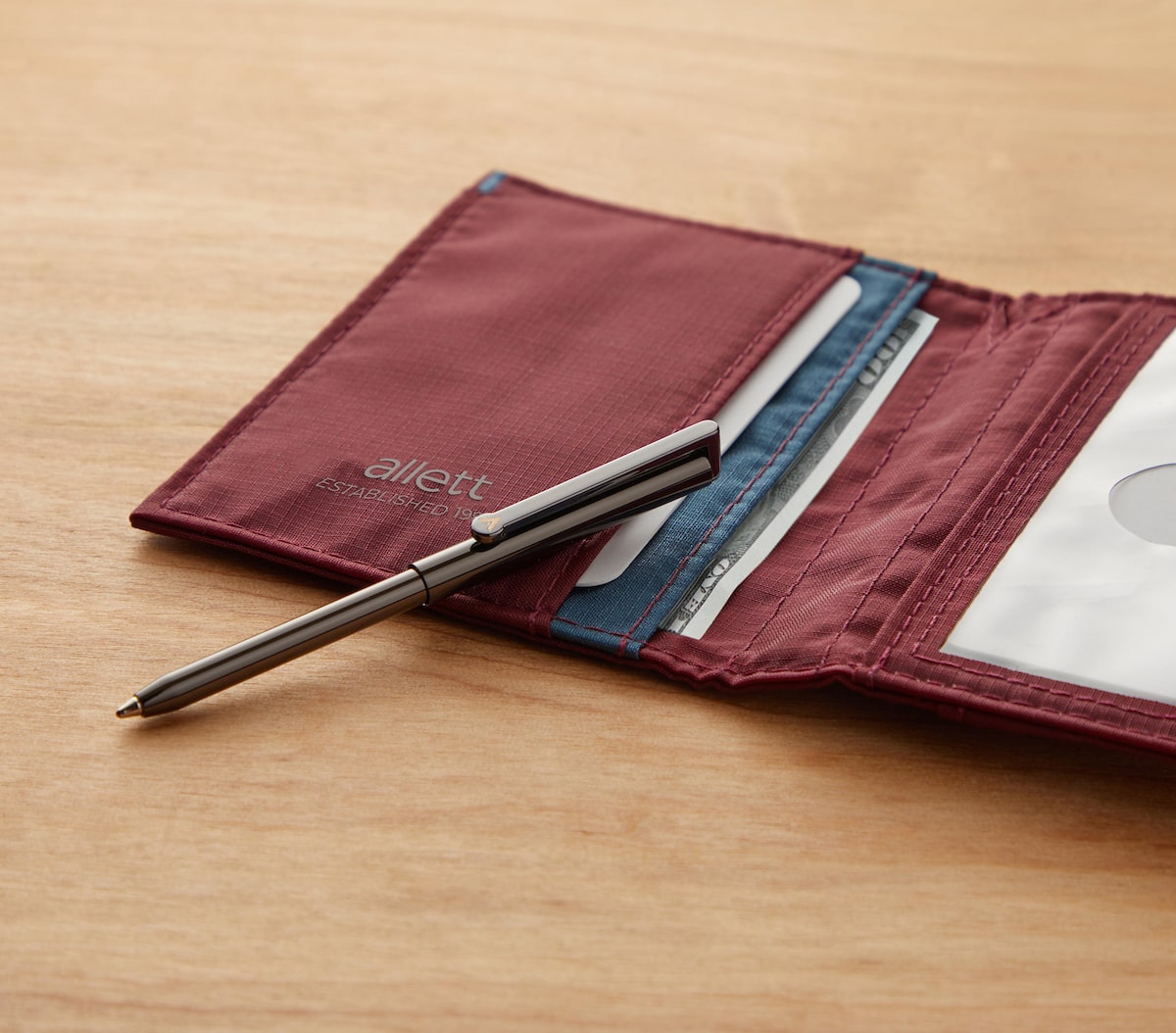 A minimalist card holder wallet that comfortably carries up to 10 cards and folded cash in this slim, vertical package. It also features a clear ID window for quick access with just a flip of the wrist. Plus, you can carry the Allett Micro Pen, so you’re ready for any moment that calls for a quick note or signature.
